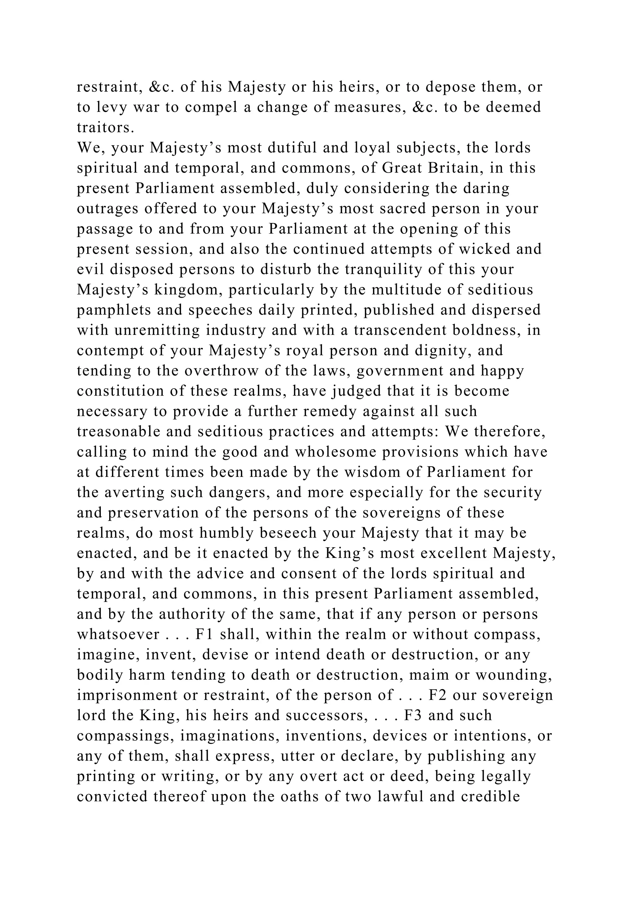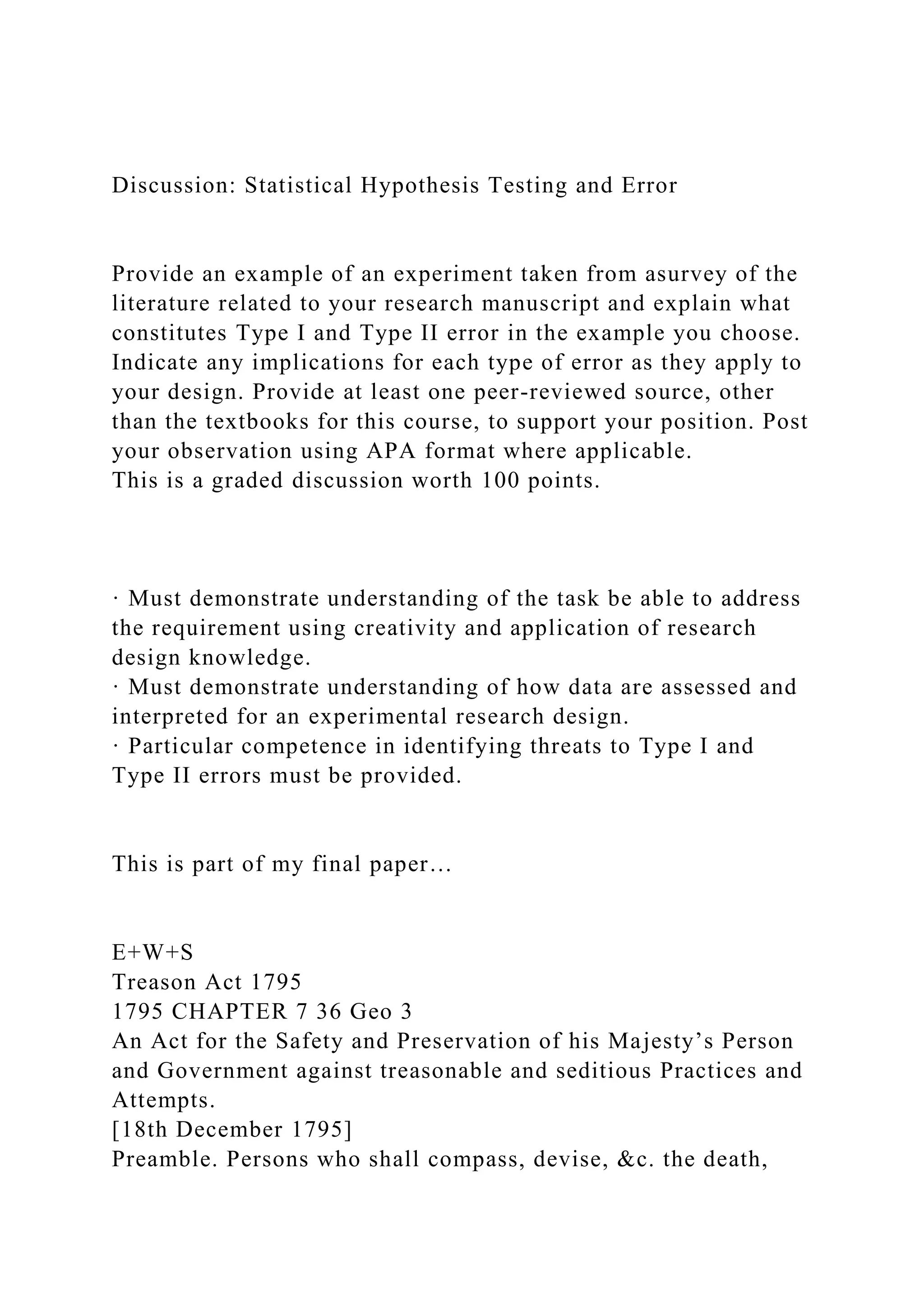 The document discusses the concepts of statistical hypothesis testing, focusing on Type I and Type II errors and their implications in experimental research design. It also includes the legal text of the Treason Act of 1795, which outlines treasonable practices against the monarchy, along with annotations highlighting amendments and alterations to the original text. The emphasis is on understanding the implications of errors in research and legal definitions of treason.