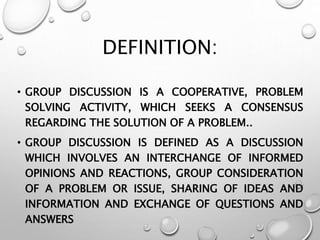 The document defines group discussion as a cooperative activity aimed at achieving consensus on problem-solving, highlighting its benefits such as knowledge sharing, skill development, and fostering critical thinking. It contrasts group discussion with symposiums, noting the advantages and disadvantages of each method in educational settings, particularly in nursing education. The symposium is described as a structured discussion led by a chairperson, focusing on a single topic but being time-consuming and less interactive for participants.