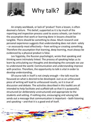This document provides discussion techniques and activities to facilitate structured talk in the classroom. It discusses the importance of talk in developing understanding and learning. Various types of structured discussion formats are described, including circle time, philosophy for children, rainbow groups, pair talk, listening triads, and envoys. These activities encourage speaking, listening, sharing of ideas, and developing concepts. The document also provides information on stimulating further discussion through techniques like jigsawing, value continuums, hot seating, and freeze frames. The overall summary is that structured discussion activities can help students learn through articulating and exploring ideas together.