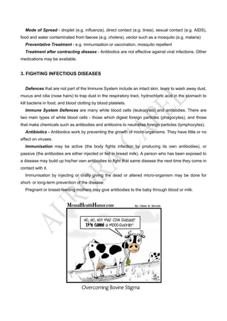 This document discusses disease and its treatment. It defines disease as any condition that prevents effective functioning in an organism. Diseases are classified as either hereditary/congenital, meaning they are present at birth, or acquired, meaning they develop after birth. Acquired diseases include infectious diseases caused by living organisms, diet/deficiency diseases from too much or too little nutrients, cancers from uncontrolled cell growth, occupational diseases from work environments, and heart diseases from risk factors like smoking. The document also discusses infectious diseases in more depth, how they are spread, treated with antibiotics or prevented through immunization, and how the immune system and its defenses work to fight disease.