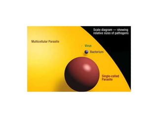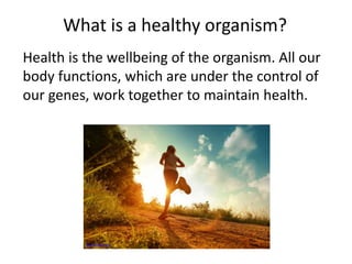 An infectious disease is caused by a pathogen that can be passed from one organism to another through various means of transmission. Non-infectious diseases are not caused by pathogens but can be genetic or related to lifestyle/environment. Pathogens are organisms that cause disease by multiplying and spreading under the right conditions. The body has multiple lines of defense against pathogens, including physical barriers, non-specific immune responses like inflammation, and a specific adaptive immune response that recognizes foreign antigens.