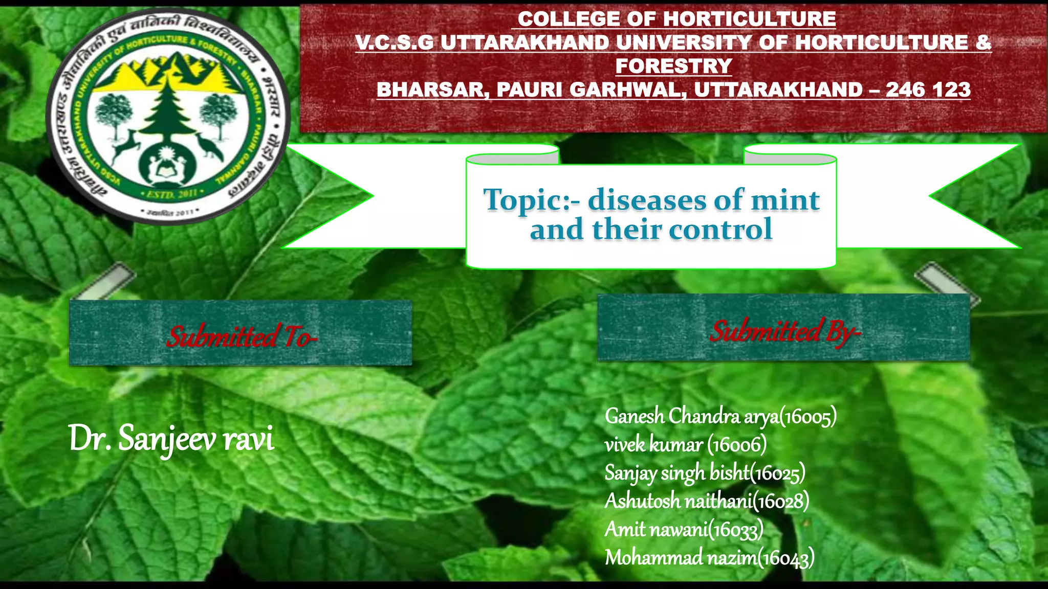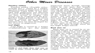 2. Some common diseases that affect mint are mint rust caused by Puccinia menthae, powdery mildew caused by Erysiphe cichoracearum, leaf spot caused by Curvularia lunata, and leaf blight caused by Alternaria alternata.