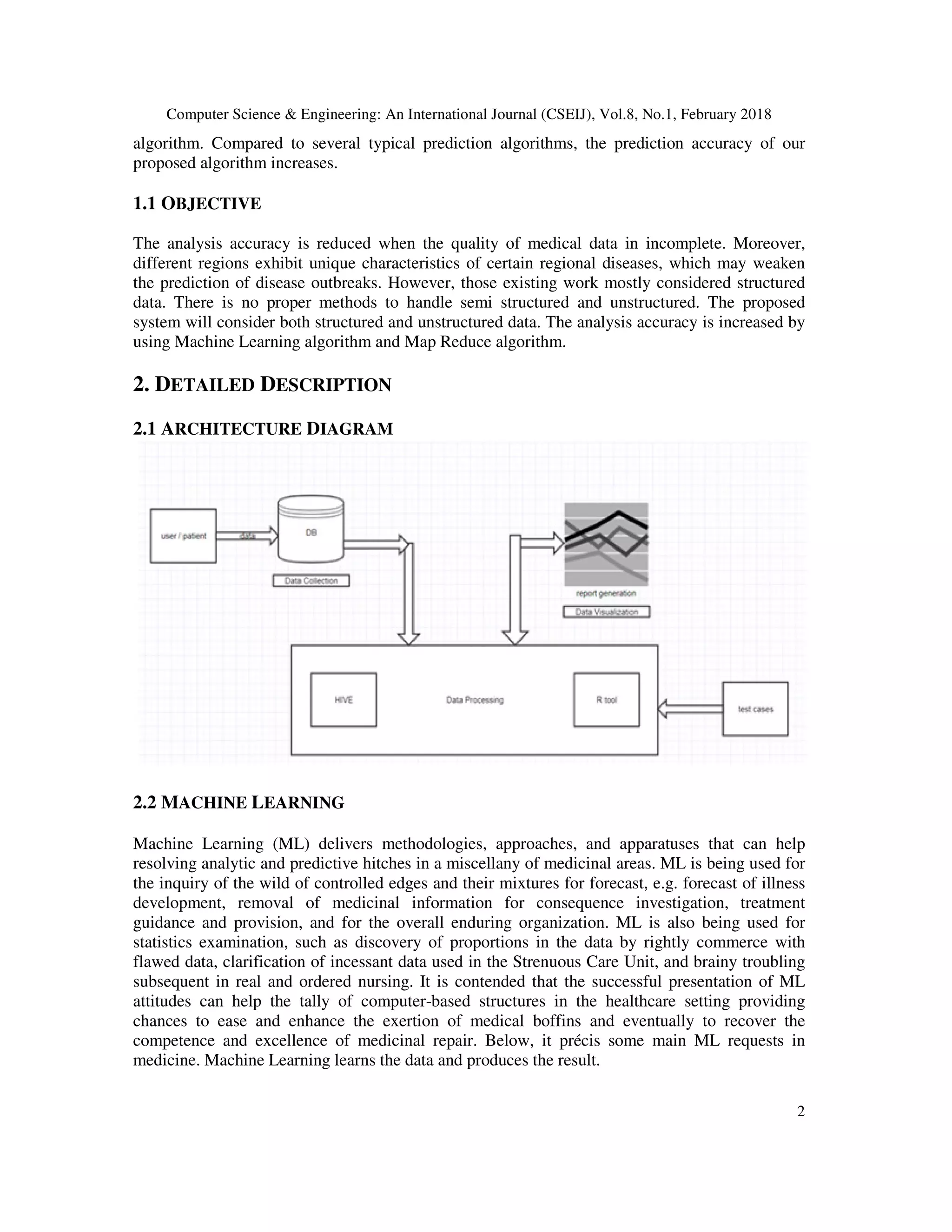 The paper discusses a proposed system that utilizes machine learning and map reduce algorithms to predict diseases by analyzing both structured and unstructured medical data, enhancing accuracy to 94.8%. The solution addresses the limitations of current methods by effectively reconstructing incomplete data and providing specific predictions for disease subtypes. The implementation shows improved efficiency and reduced query retrieval times, making it accessible and practical for healthcare applications.