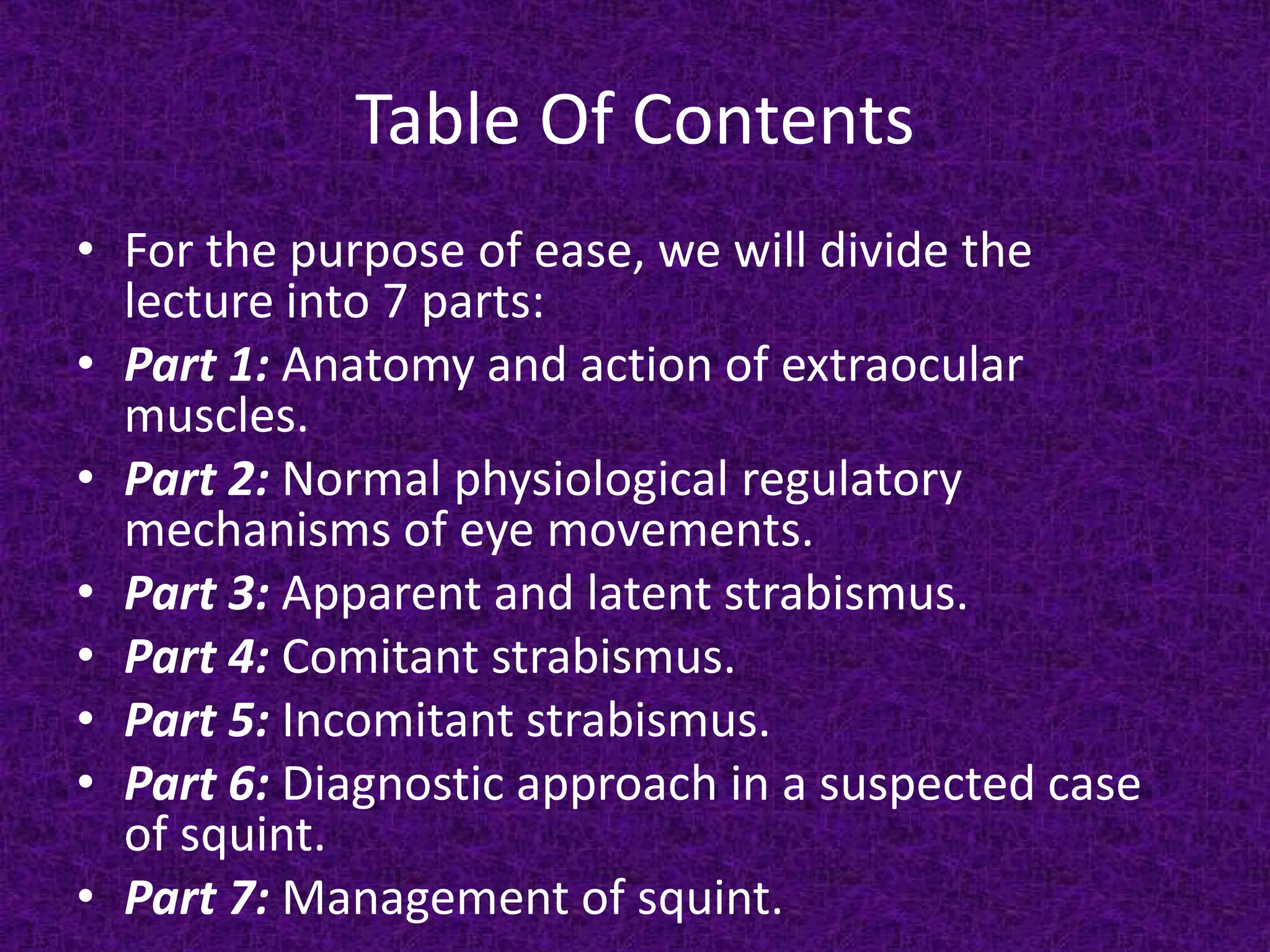 The document discusses disorders of ocular motility, covering the anatomy and functions of extraocular muscles, mechanisms of eye movement, strabismus types, and their clinical implications. It details various forms of strabismus, including apparent, latent, comitant, and incomitant, along with their causes, symptoms, and treatments. The document serves as a comprehensive lecture on ocular motility, addressing both theoretical and practical aspects relevant to eye movement disorders.