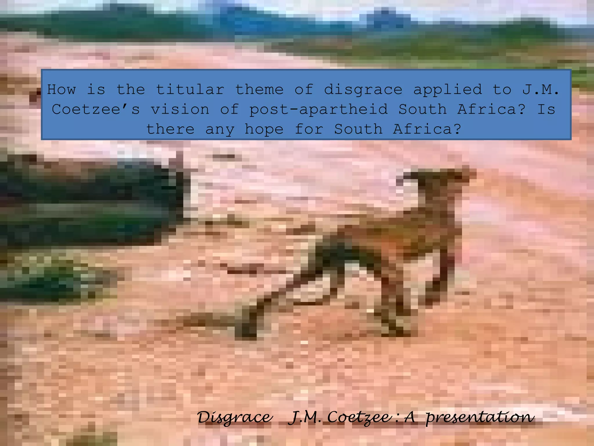 The document discusses how the theme of "disgrace" is applied to J.M. Coetzee's vision of post-apartheid South Africa in his novel Disgrace. It analyzes how the novel portrays the disgrace of the decline of Western intellectualism, the AIDS epidemic, poor policing, the failure of the Rainbow Nation ideal, and the incompatibility of cultures in South Africa. However, it suggests that through characters like Melanie, there is still hope that South Africa can overcome its current disgraced state and fulfill the dream of becoming a just multicultural nation.
