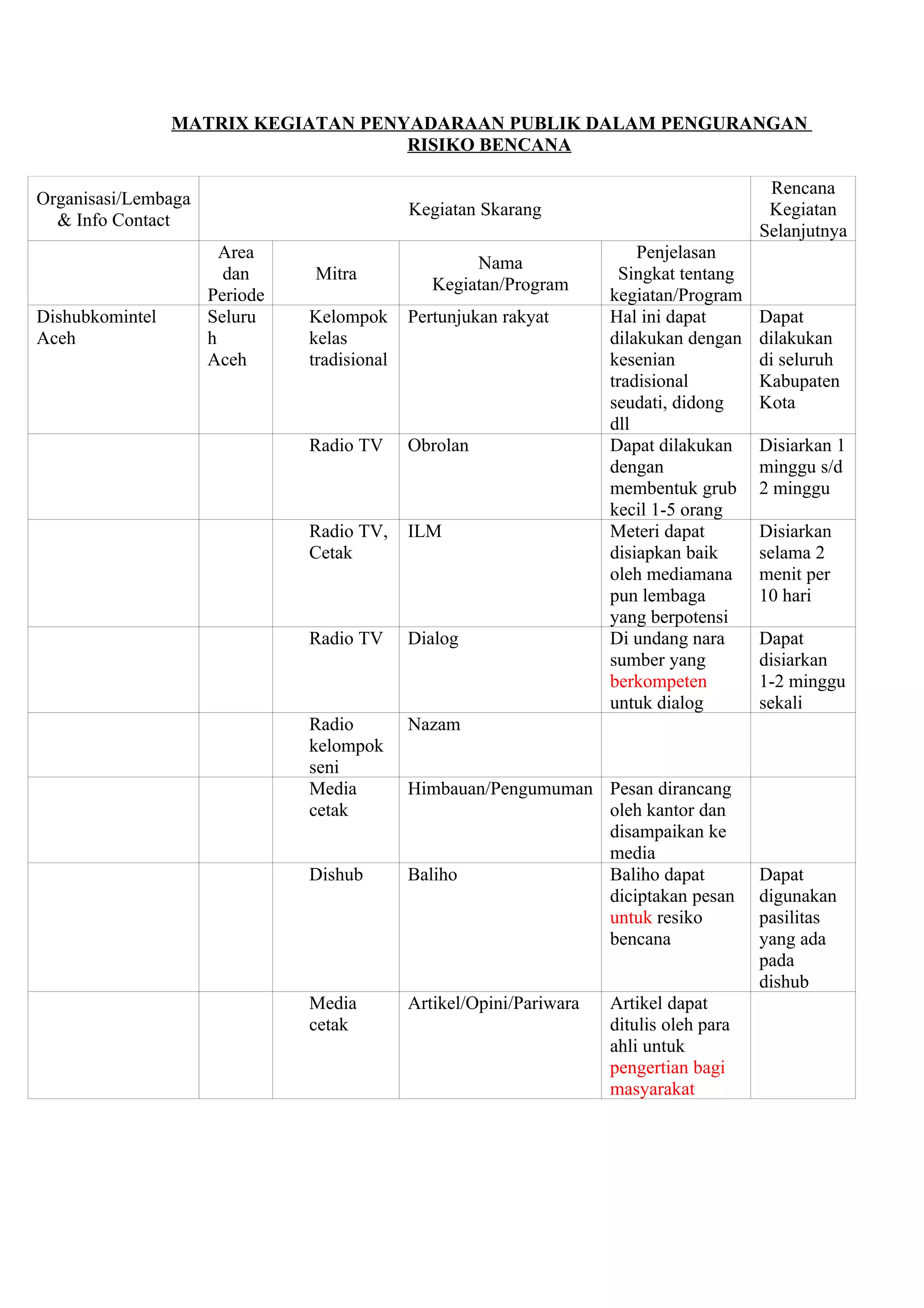 Dokumen ini menguraikan rencana kegiatan penyadaran publik untuk pengurangan risiko bencana melalui kolaborasi berbagai lembaga dan media. Kegiatan mencakup pertunjukan seni tradisional, penyiaran radio dan TV, serta pembuatan materi cetak untuk edukasi masyarakat. Semua ini bertujuan untuk meningkatkan pemahaman masyarakat tentang risiko bencana dan mitigasinya.