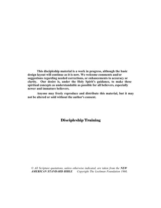This document outlines a biblical model for discipleship that incorporates both personal and corporate elements. It advocates for "balanced discipleship" where each believer receives individual attention and instruction from a "spiritual parent" in addition to participating in church-wide Bible teaching, preaching, and small groups. The model is based on Paul's example in 1 Thessalonians of caring for new believers like a mother or father would care for children. It emphasizes that personal discipleship can help accelerate spiritual growth for new Christians by addressing their unique needs during a formative period when they are open to spiritual guidance.