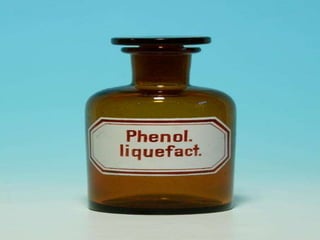 The document discusses disinfection, providing definitions and outlining factors that determine a disinfectant's potency. It describes ideal characteristics for disinfectants and lists common chemical agents used, including their mechanisms and uses. Different levels of disinfection are defined. Specific disinfectants like alcohols, aldehydes, dyes, halogens and phenols are explained in detail. Methods for disinfecting various surfaces and materials are provided.