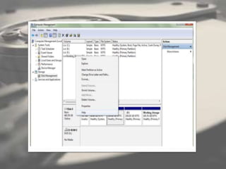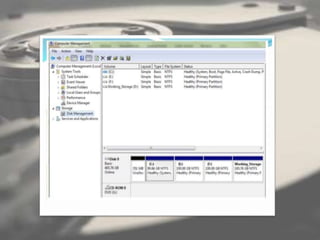 This document provides an overview of disk management. It begins by explaining the difference between discs and disks, with discs referring to optical media like CDs and DVDs that are removable, while disks refer to magnetic hard drives and drives that are not removable. It then covers disk terminology like cylinders, tracks, and sectors. Next, it describes disk structure including platters, tracks, read/write heads, and cylinders. The document discusses disk scheduling algorithms like first-come first-served, shortest seek time first, and scan. Finally, it lists some common disk management operations and tools.
