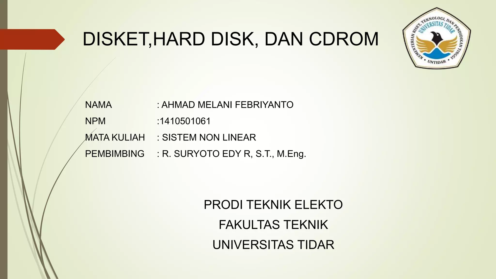 Dokumen ini membahas tentang berbagai media penyimpanan data, termasuk disket, hard disk, dan CD-ROM, serta fungsi dan bagian-bagian masing-masing. Disket adalah media penyimpanan magnetis yang kini jarang digunakan, sedangkan hard disk berfungsi sebagai penyimpanan permanen untuk data dengan kapasitas besar, dan CD-ROM digunakan untuk membaca data dan dapat menyimpan hingga 700MB. Selain itu, dokumen juga menjelaskan jenis-jenis CD-ROM seperti CD-R dan CD-RW.