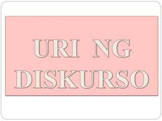 Ang diskurso ay isang pormal na pagtalakay sa isang paksa, pasulat man o pasalita, at may dalawang anyo: pasalita at pasulat. Ito ay nagsisilbing paraan ng pagpapahayag ng ideya at naglalaman ng iba pang sangkap ng komunikasyon na nakakaapekto sa mensahe, tulad ng tono at kilos. Layunin ng diskurso na nagbibigay ng malinaw na imahen at impormasyon, naglalarawan ng mga karanasan, at nagpapaliwanag ng mga isyu upang makakuha ng atensyon ng tagapakinig o mambabasa.