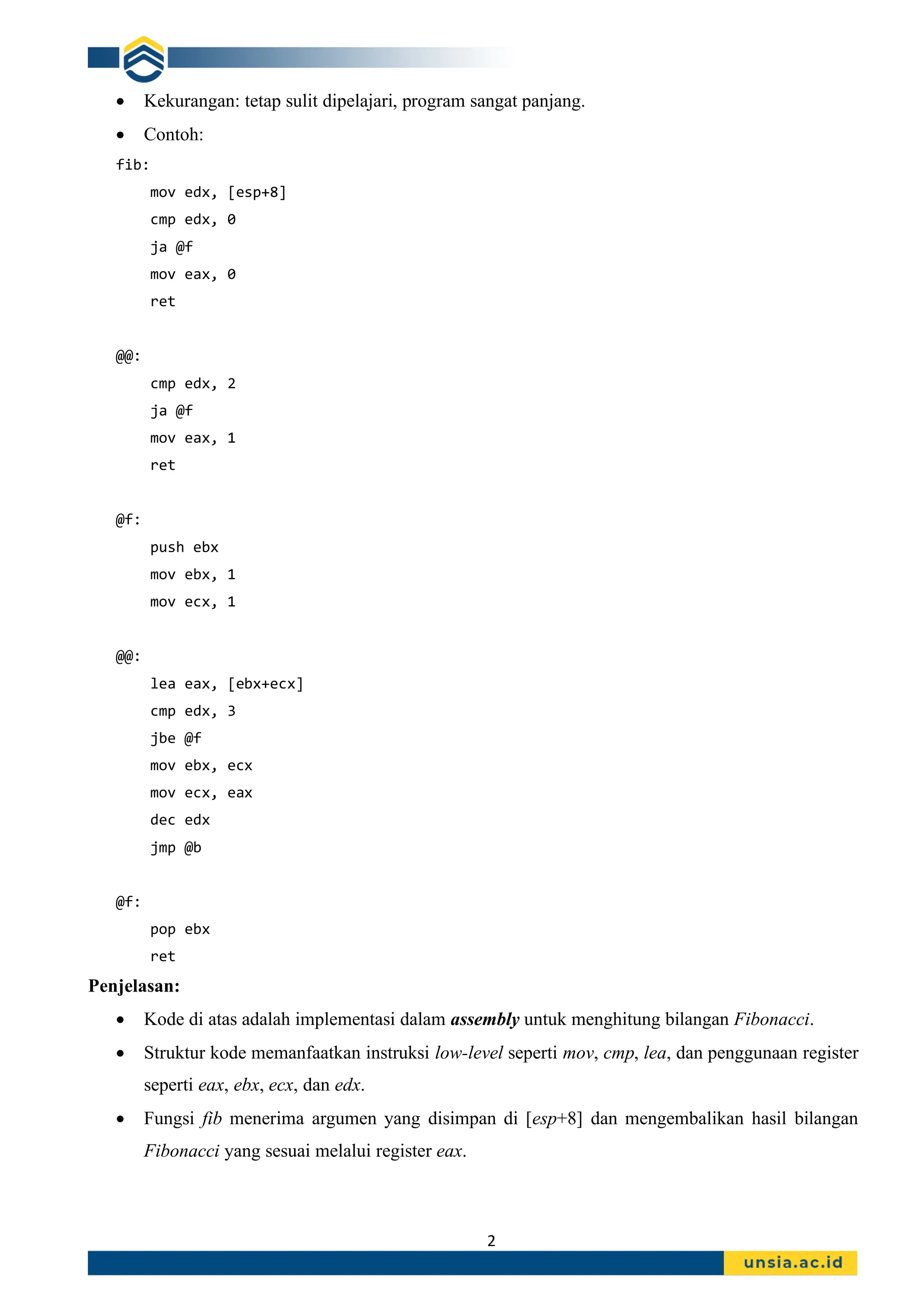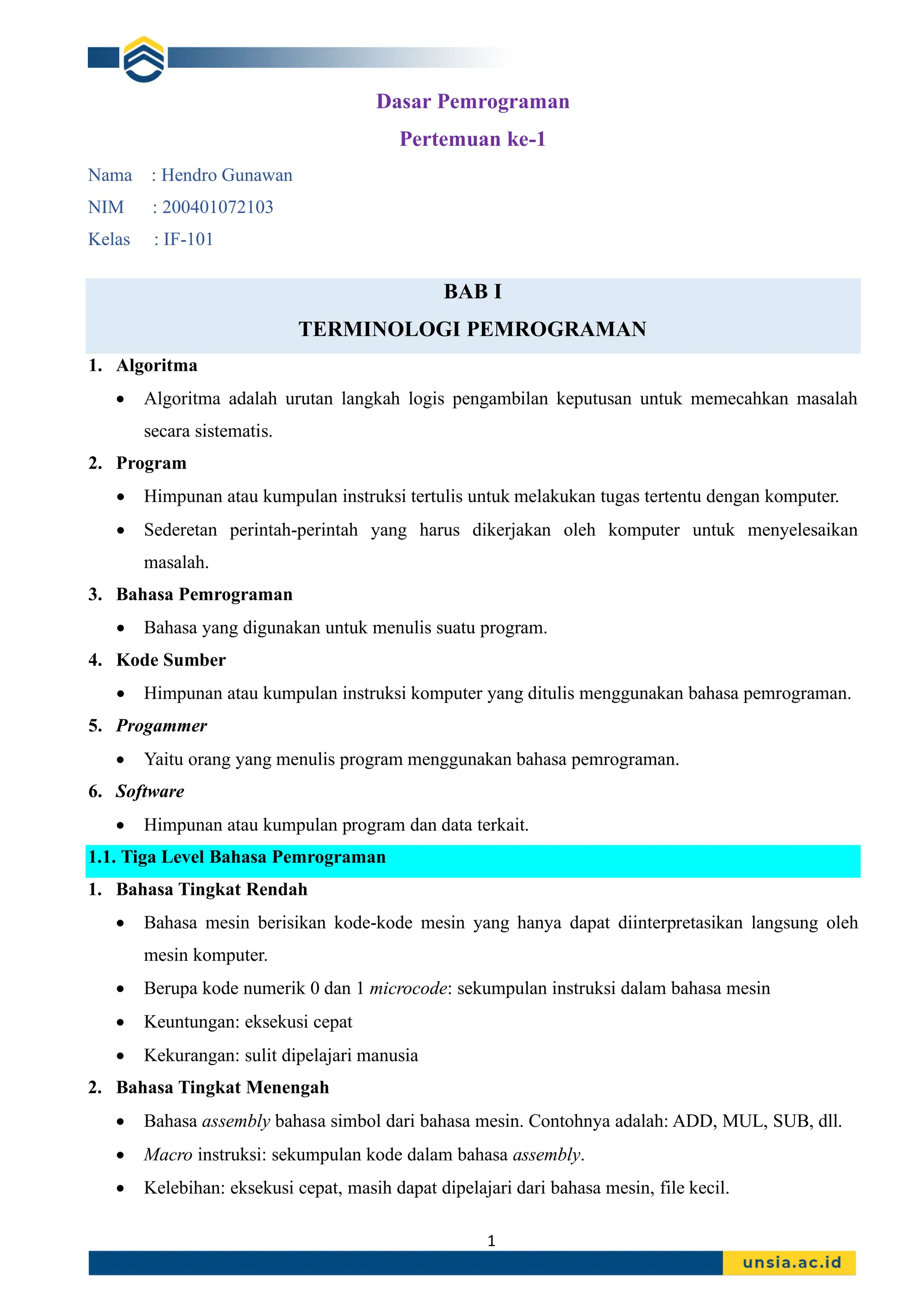 Dokumen ini menjelaskan dasar-dasar pemrograman, termasuk terminologi seperti algoritma, program, dan bahasa pemrograman. Terdapat penjelasan mengenai tiga level bahasa pemrograman: bahasa tingkat rendah, menengah, dan tinggi, serta paradigma pemrograman seperti imperative dan object-oriented. Selain itu, dokumen ini juga membahas tahapan pemecahan masalah dan memberikan contoh implementasi algoritma untuk menyelesaikan persamaan linear.