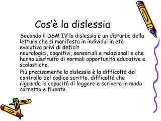 La dislessia è un disturbo della lettura che colpisce i bambini senza deficit neurologici o intellettivi e si manifesta con difficoltà nella decodifica del codice scritto. È stata osservata una componente genetica e biologica che ne determina la presenza in famiglie, e le difficoltà di lettura si manifestano fin dalla scuola materna. La diagnosi richiede un approccio multidisciplinare e gli interventi terapeutici devono adattarsi alle esigenze specifiche del bambino per migliorare la sua autostima e le capacità di apprendimento.
