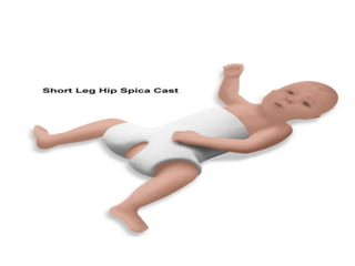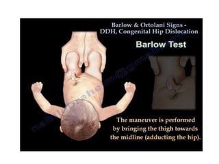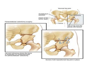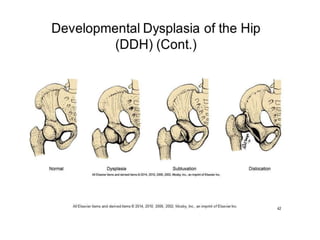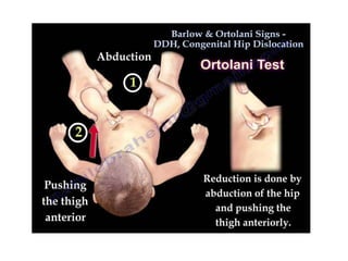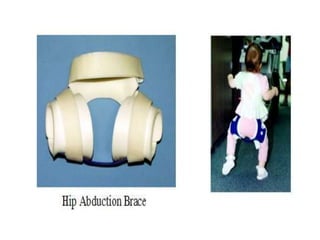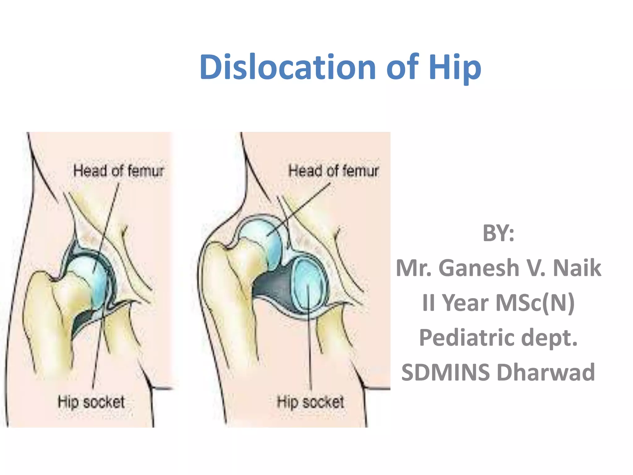 Dislocation of the hip is a congenital or acquired deformity where the head of the femur is improperly aligned with the acetabulum cavity. It can range from mild acetabular dysplasia to complete dislocation. Risk factors include female sex, breech presentation, and family history. Clinical features depend on age but may include leg length discrepancy, limited hip motion, or abnormal gait. Diagnosis involves physical exam, ultrasound, and x-rays. Treatment varies by age but may include use of pelvic harnesses, skin traction, surgery, and casting to relocate the femoral head.