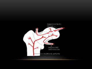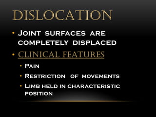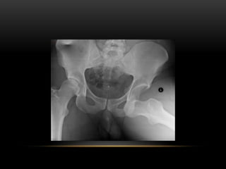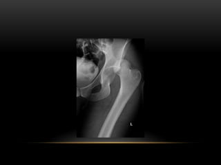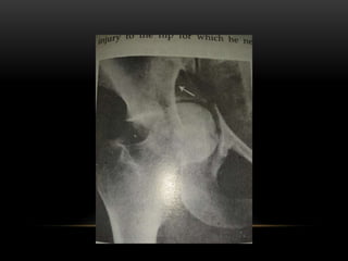 This document discusses hip dislocations, including types, causes, signs, treatments, and complications. It describes three main types of hip dislocation - posterior, anterior, and central. Posterior dislocations are the most common and often result from dashboard injuries, causing the leg to appear short, adducted, internally rotated and flexed. Treatment involves closed or open reduction depending on the severity of the dislocation and any fractures. Complications can be early such as nerve palsies or late such as avascular necrosis and osteoarthritis.