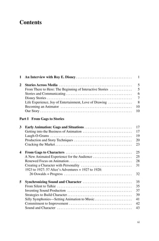 The document is a comprehensive exploration of Disney's history, animation techniques, and storytelling across various media. It includes insights from significant figures like Roy E. Disney and detailed discussions on topics such as character creation, sound synchronization, and transmedia engagement. The content spans from early animation to contemporary interactive experiences, highlighting Disney's cultural impact and innovations in storytelling.