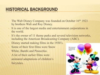The Walt Disney Company was founded in 1923 by Walt and Roy Disney and is now one of the largest media corporations in the world, owning theme parks and television networks. Pixar Animation Studios was founded in 1986 when Steve Jobs purchased the computer graphics division of Lucasfilm and established Pixar. Pixar's 1995 film Toy Story was a huge success and changed animation. In 2006, Disney acquired Pixar to gain access to its technology and talent, while Pixar sought to increase revenue through Disney's distribution.