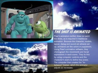 Pixar is an animation studio based in California that is known for its CGI animated films. Pixar has won 22 Academy Awards for its films, which are created using its own RenderMan rendering software. Pixar released its first feature film, Toy Story, in 1995 and has since produced several other successful films using CGI animation and compelling storylines.
