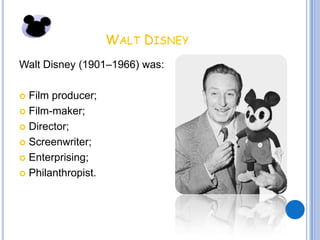 Walt Disney was a film producer, director, screenwriter, and entrepreneur who is known for his cartoon characters like Mickey Mouse. After visiting a park with his daughters, Disney got the idea for a theme park where both children and adults could have fun and learn. He went on to create Disneyland, the first Disney theme park, which opened in Anaheim, California in 1955 and was an immediate success, now receiving over 14 million visitors annually.