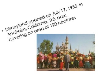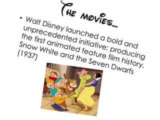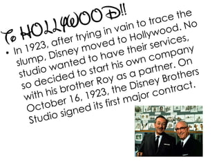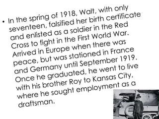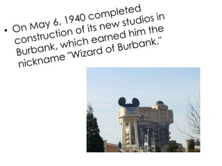 Walt Disney started his career in animation by working at an advertising agency where he met Ubbe Iwerks. They started their own commercial art studio together but it only lasted a month. Disney then conceived the idea for Mickey Mouse while traveling on a train. In 1928, his third Mickey Mouse film featuring sound was a success. Disney went on to create many animated films and characters but also dreamed of building an amusement park, which later became Disneyland. He grew his company successfully but died in 1966 from lung cancer without seeing The Jungle Book finished. Disney Studios later found great success again in the 1990s with films like Beauty and the Beast.