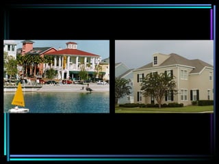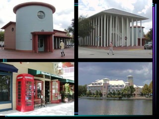 The document discusses Celebration, Florida, a town created by Disney as an idealized American community or "utopia." It provides background on Walt Disney's vision for Celebration and describes some reasons why many people were drawn to move there when it opened in 1996, noting its clean streets, nice architecture, and sense of safety and order. Photos are also included showing aspects of life in Celebration.