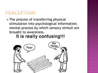 The document discusses various types of perceptual abnormalities including sensory distortions, deceptions, and illusions. It describes abnormalities in different senses such as vision, hearing, touch, and others. Sensory distortions can involve changes in intensity, color, shape, size, motion, or location of perceived objects. Illusions can be completion, affective, or pareidolic in nature. Hallucinations are false perceptions without an external stimulus and can occur in any sensory modality. Organic causes as well as psychiatric conditions can produce different perceptual abnormalities. The document provides examples and details of many specific perceptual disorders.