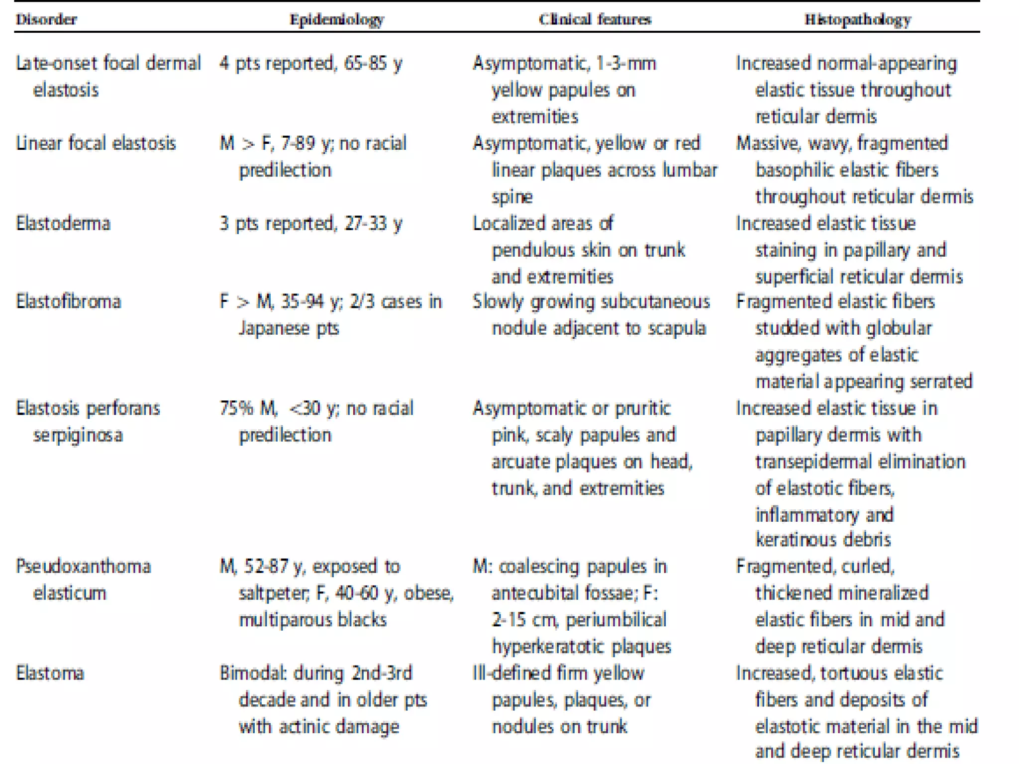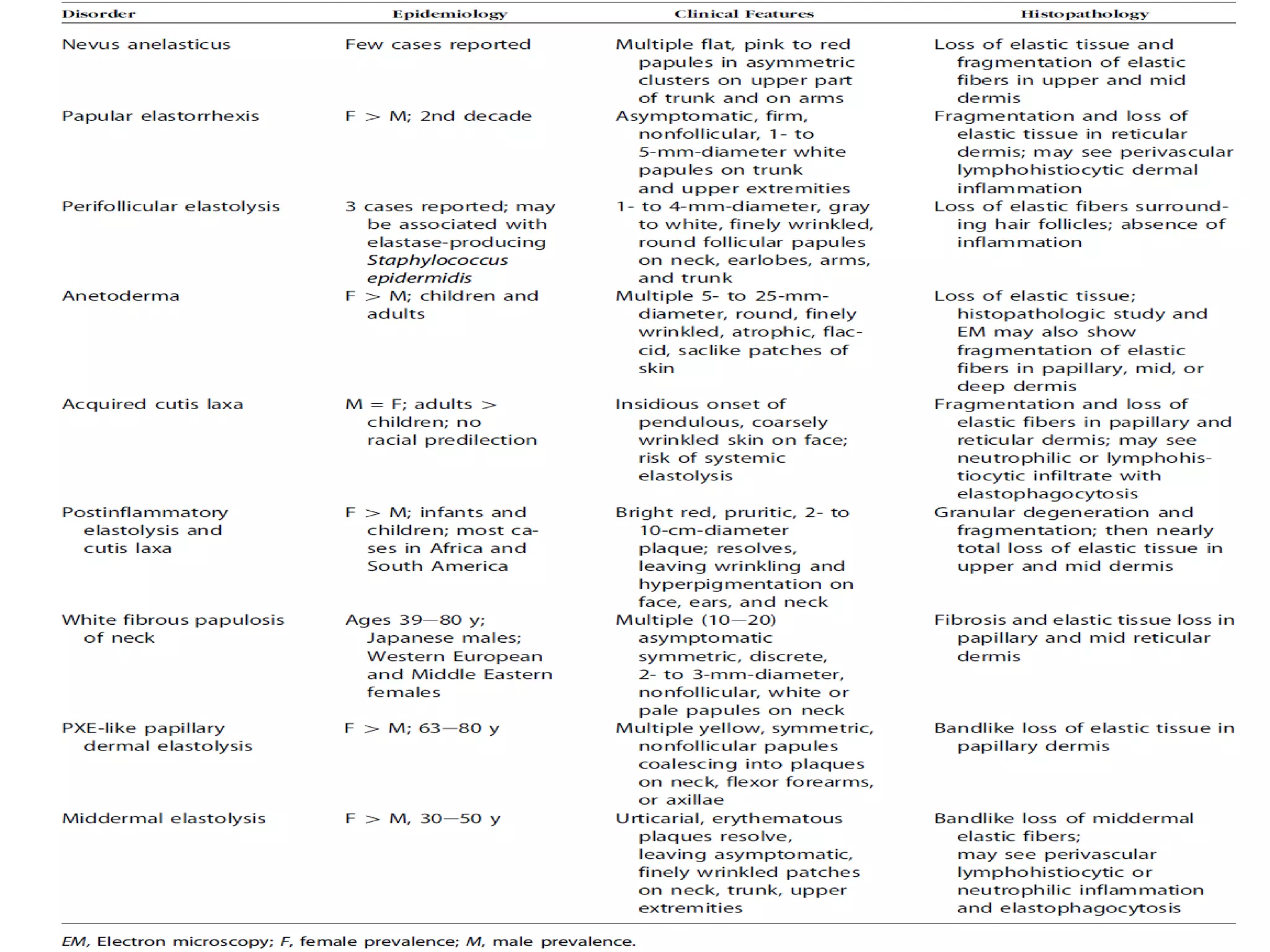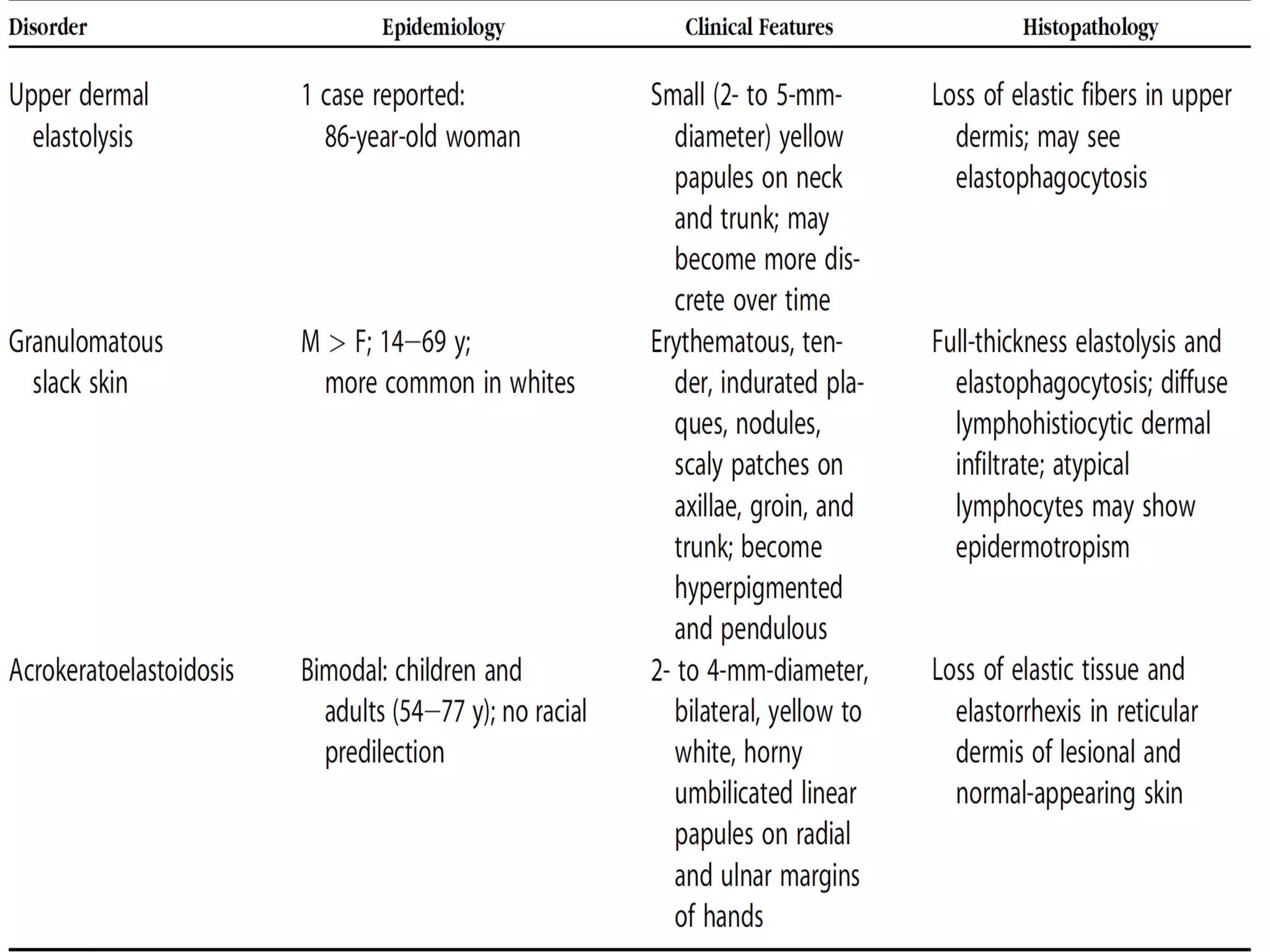 Elastic Tissue disorders involves several conditions related to elastic fibers in the skin. Elastic fibers provide resilience and elasticity to skin and are composed of microfibrils surrounding an elastin core. Elastin is synthesized by fibroblasts and crosslinked to form mature elastic fibers predominantly in the reticular dermis. Several disorders result from accumulation or degeneration of elastic fibers, producing clinical and histopathologic features. These include focal dermal elastosis, elastofibroma, Favre-Racouchot syndrome, papular elastorrhexis, anetoderma, and elastosis perforans serpiginosa. Inherited connective tissue disorders can also affect elastic fibers, including Ehlers