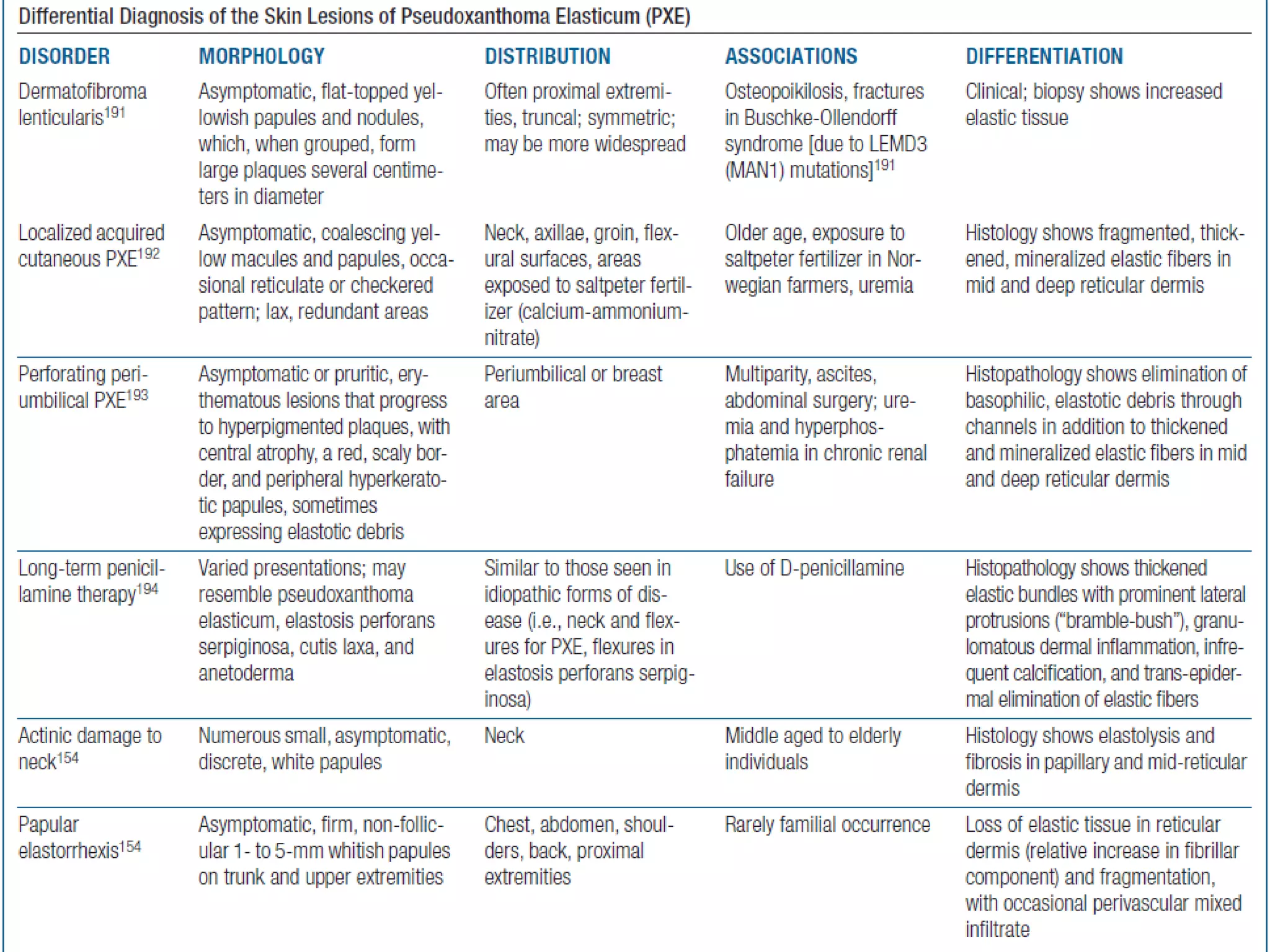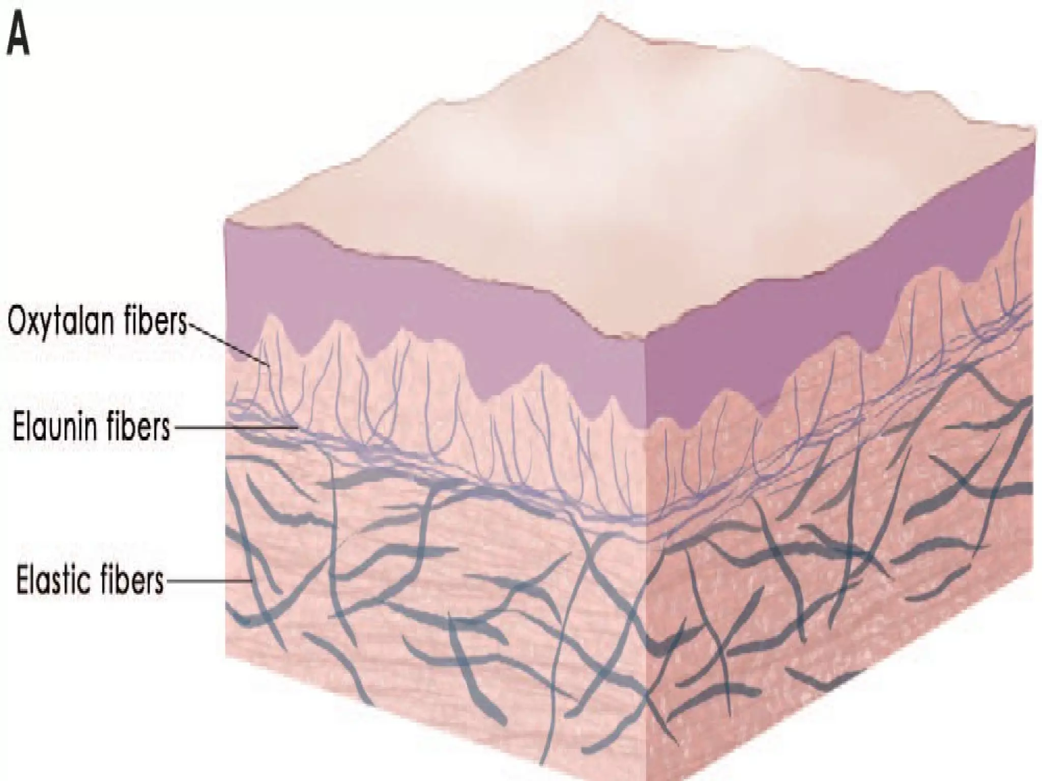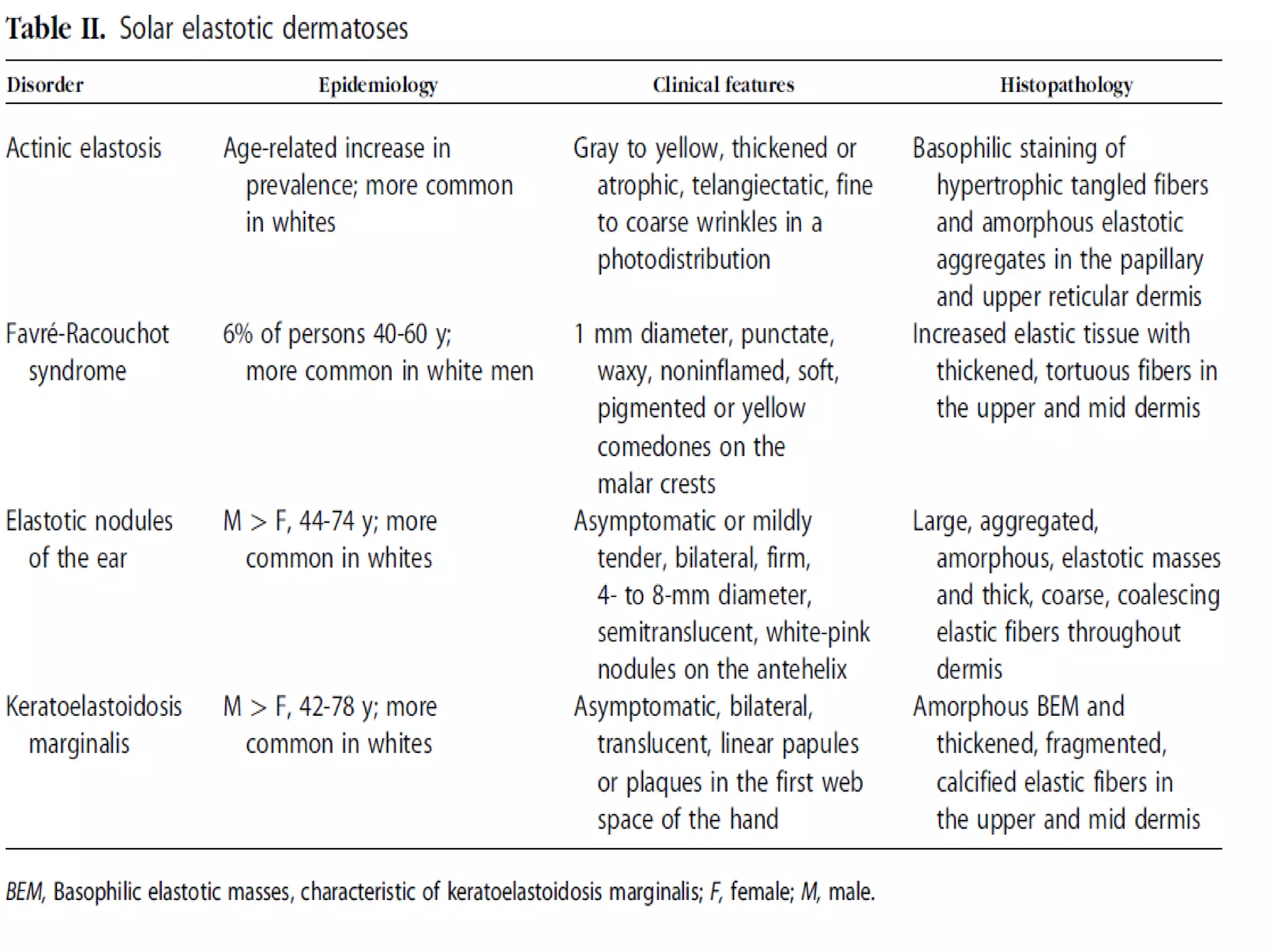 Elastic Tissue disorders involves several conditions related to elastic fibers in the skin. Elastic fibers provide resilience and elasticity to skin and are composed of microfibrils surrounding an elastin core. Elastin is synthesized by fibroblasts and crosslinked to form mature elastic fibers predominantly in the reticular dermis. Several disorders result from accumulation or degeneration of elastic fibers, producing clinical and histopathologic features. These include focal dermal elastosis, elastofibroma, Favre-Racouchot syndrome, papular elastorrhexis, anetoderma, and elastosis perforans serpiginosa. Inherited connective tissue disorders can also affect elastic fibers, including Ehlers