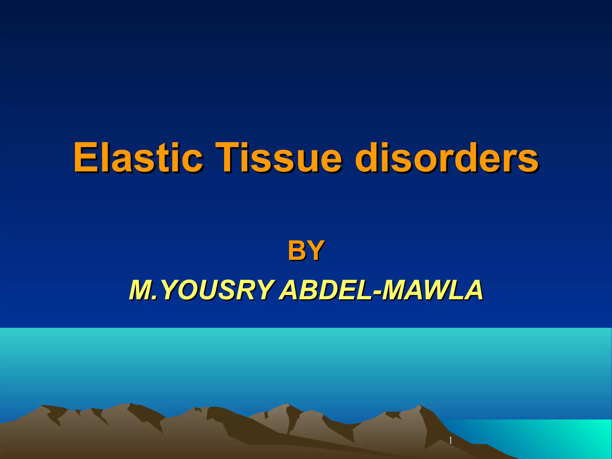 2. The document describes several such disorders, including pseudoxanthoma elasticum where elastic fibers are abnormally clumped and fragmented, and congenital cutis laxa where elastic fibers are sparse and fragmented leading to loose, inelastic skin.