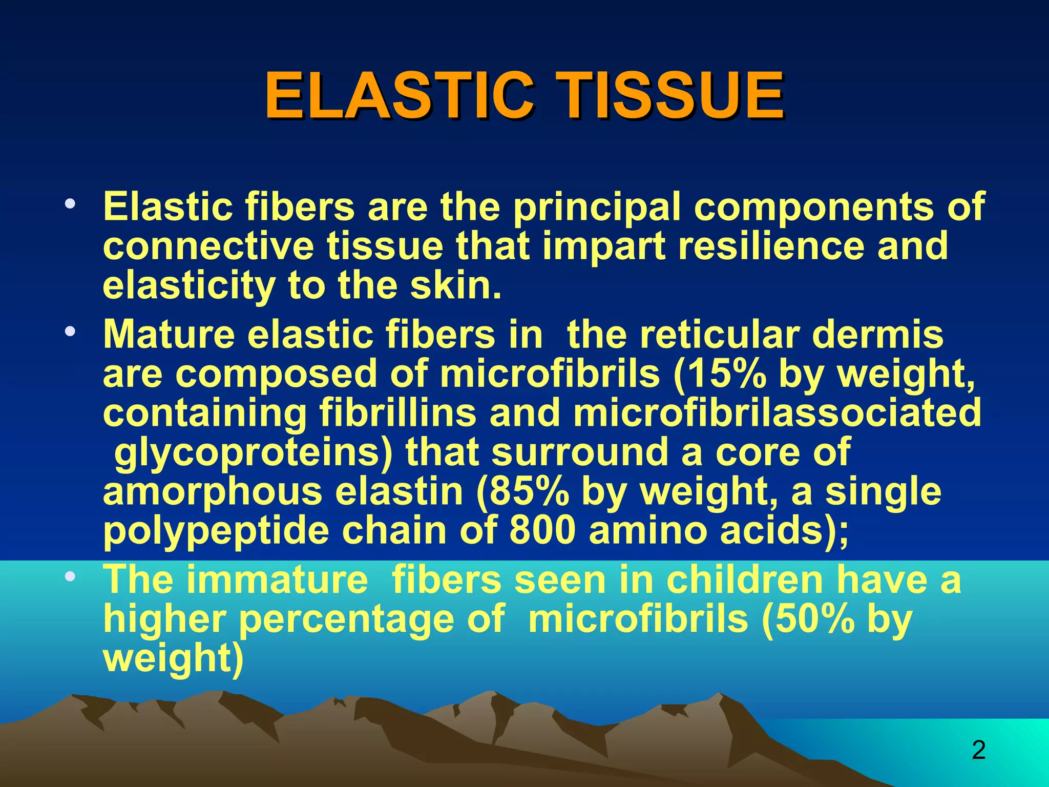 1. Elastic fibers are key components of connective tissue that provide resilience and elasticity to skin. Disorders impacting elastic fibers can produce changes in skin appearance and structure.