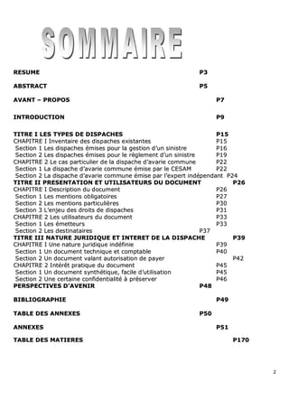 PP55 AAVVAANNTT PPRROOPPOOSS PP77 IINNTTRROODDUUCCTTIIOONN PP99 TTIITTRREE II :: LLEESS TTYYPPEESS DDEE DDIISSPPAACCHHEESS PP1155 CCHHAAPPIITTRREE 11 :: IInnvveennttaaiirree ddeess ddiissppaacchheess eexxiissttaanntteess PP1155 SSeeccttiioonn 11 :: LLeess ddiissppaacchheess éémmiisseess ppoouurr llaa ggeessttiioonn dd’’uunn ssiinniissttrree PP1166 11 -- LLaa ddiissppaacchhee dd’’aaccoommppttee PP1166 22 -- LLaa ddiissppaacchhee dd’’aappppeell ddee ffoonnddss PP1177 33 -- LLaa ddiissppaacchhee ddee ppeeiinneess eett ssooiinnss PP1177 44 -- LLaa ddiissppaacchhee ddee rrééppaarrttiittiioonn ddee ffrraaiiss PP1188 55 -- LLaa ddiissppaacchhee dd’’aannnnuullaattiioonn PP1188 SSeeccttiioonn 22 :: LLeess ddiissppaacchheess éémmiisseess ppoouurr llee rrèègglleemmeenntt dd’’uunn ssiinniissttrree PP1199 11 -- LLee pprroojjeett ddee ddiissppaacchhee PP1199 22 -- LLaa ddiissppaacchhee ddee rrèègglleemmeenntt oouu ddééffiinniittiivvee PP2200 33 -- LLaa ddiissppaacchhee ccoommpplléémmeennttaaiirree PP2200 44 -- LLaa ddiissppaacchhee rrééccaappiittuullaattiivvee PP2200 55 -- LLaa ddiissppaacchhee ddeevviissee PP2211 66 -- LLaa ddiissppaacchhee ssaauuvveettaaggee PP2211 CCHHAAPPIITTRREE 22 :: LLee ccaass ppaarrttiiccuulliieerr ddee llaa ddiissppaacchhee dd’’aavvaarriiee ccoommmmuunnee PP2222 SSeeccttiioonn 11 :: LLaa ddiissppaacchhee dd’’aavvaarriiee ccoommmmuunnee éémmiissee ppaarr llee CCEESSAAMM PP2222 SSeeccttiioonn 22 :: LLaa ddiissppaacchhee dd’’aavvaarriiee ccoommmmuunnee éémmiissee ppaarr ll’’eexxppeerrtt IInnddééppeennddaanntt PP2244 TTiittrree IIII :: PPRREESSEENNTTAATTIIOONN EETT UUTTIILLIISSAATTEEUURRSS DDUU DDOOCCUUMMEENNTT PP2266 CCHHAAPPIITTRREE 11 :: DDeessccrriippttiioonn PP2266 SSeeccttiioonn 11 :: LLeess mmeennttiioonnss oobblliiggaattooiirreess PP2277 SSeeccttiioonn 22 :: LLeess mmeennttiioonnss ppaarrttiiccuulliièèrreess PP3300 SSeeccttiioonn 33 :: LL’’eennjjeeuu ddeess ddrrooiittss ddee ddiissppaacchhee PP3311