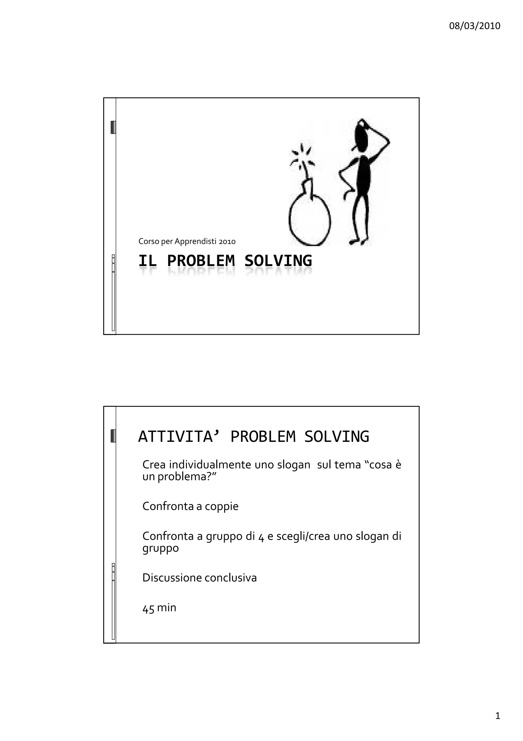 Il documento descrive un corso di problem solving per apprendisti, esplorando la natura dei problemi e come affrontarli. Si evidenzia che un problema deve essere definito correttamente per essere risolto efficacemente, distinguendo tra problema, ostacolo, obiettivo e soluzione. Inoltre, viene delineato un processo di problem solving in quattro fasi: identificazione del problema, generazione di soluzioni, valutazione e pianificazione.