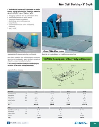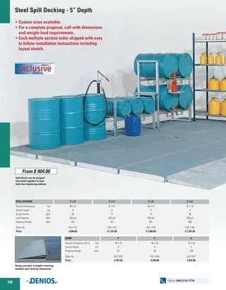 The document outlines various steel spill decking options designed for effective spill containment during mixing, dispensing, or pumping operations. It highlights features such as heavy gauge galvanized steel construction, ease of maintenance, and flexibility in design, along with details on dimensions, load capacities, and prices. Custom sizes and configurations are available to meet specific facility needs.