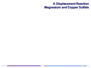 A solution of copper sulphate was placed on a spotting tile and magnesium powder was added. Over ten minutes, the solution fizzed and turned colorless as a brown solid formed at the bottom, indicating a replacement reaction between the magnesium and copper sulphate that produced magnesium sulphate and copper. The word equation summarizing the reaction is: copper sulphate + magnesium → magnesium sulphate + copper.