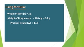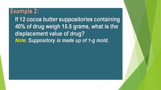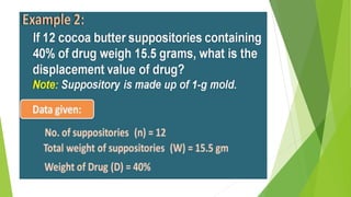 This document discusses suppositories and their displacement value. It is from Matoshri education Society’s M.A.B.D DIPLOMA COLLEGE OF PHARMACY in Babhulgaon, Nashik, Maharashtra. The document provides references on suppositories and their properties.