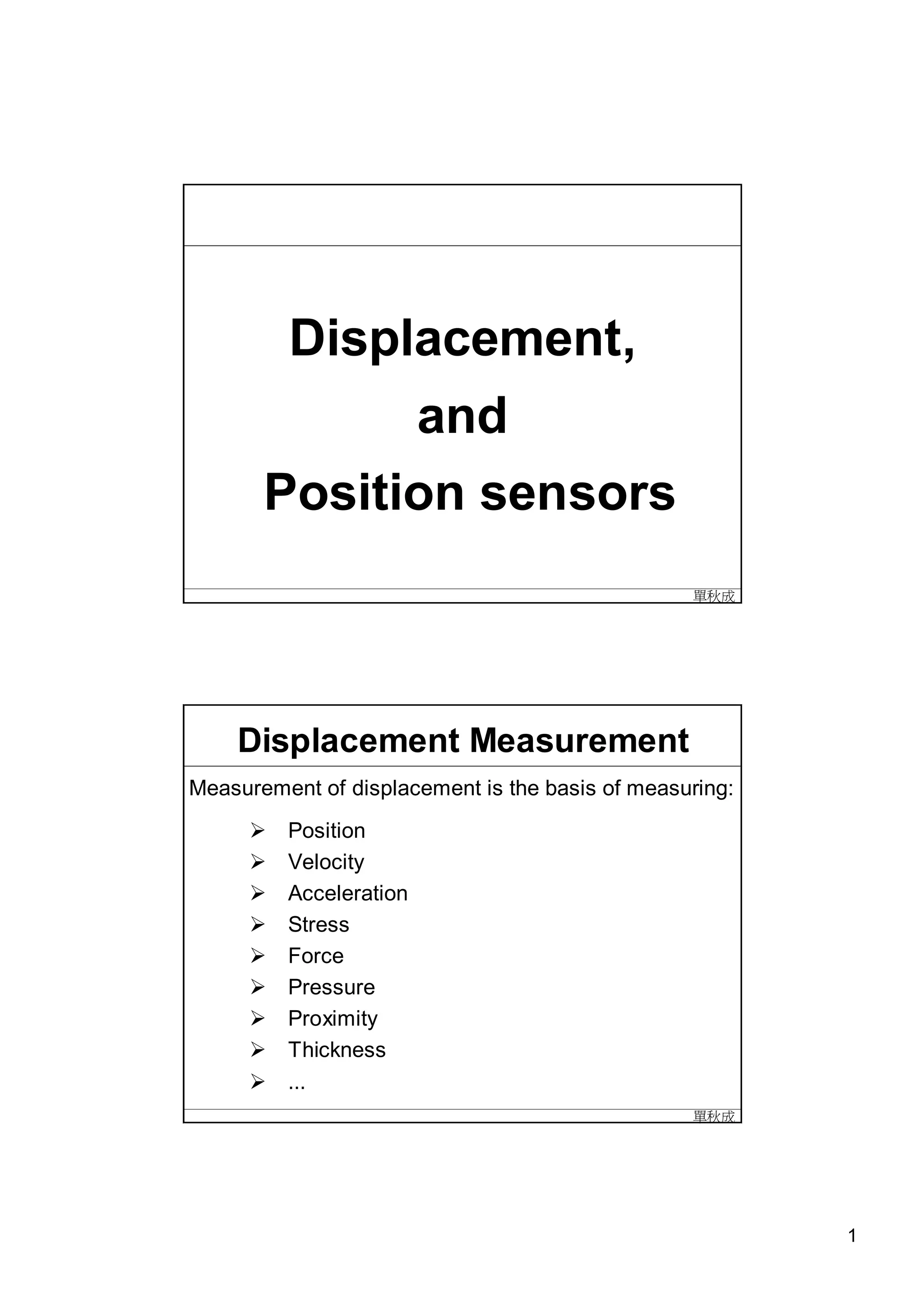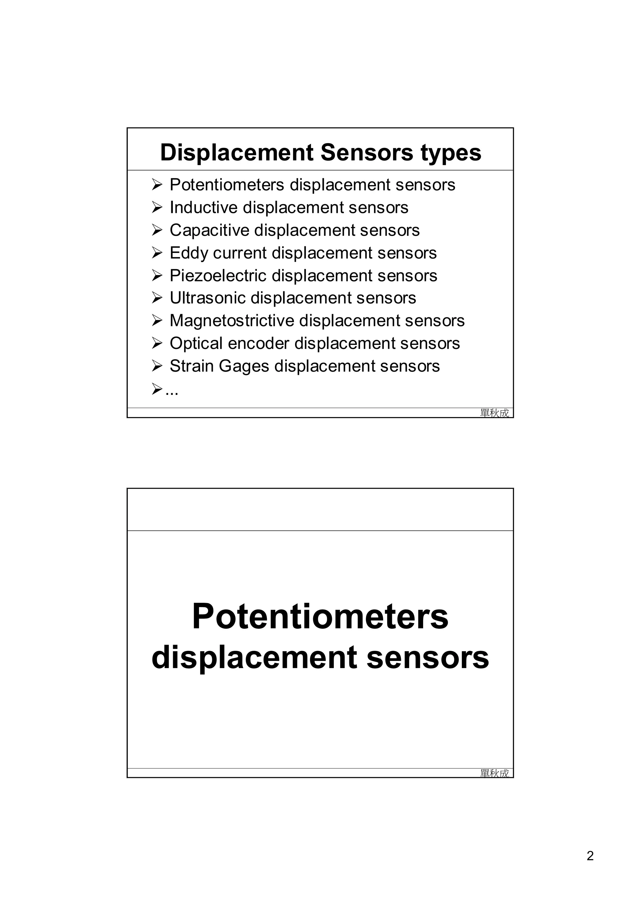 The document discusses different types of displacement and position sensors. It describes resistive sensors like potentiometers that measure displacement by detecting changes in resistance as a conductive wiper slides along a resistive element. Inductive sensors are also covered, including linear variable differential transformers (LVDTs) that measure displacement by detecting changes in inductance as a magnetic core moves. Capacitive sensors are explained as measuring displacement through variations in capacitance that occur when the distance between capacitor plates changes.