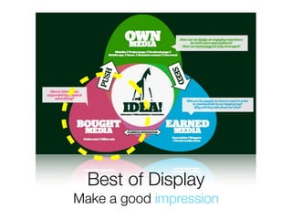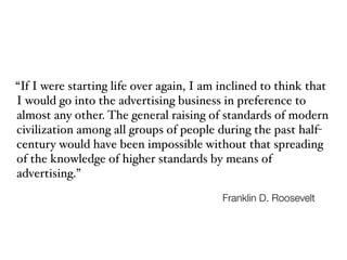 Franklin D. Roosevelt believed that advertising has played a key role in raising standards of modern civilization by spreading knowledge of higher standards. Display advertising allows for entertaining and engaging experiences when interactive, timely, and relevant. Effective display ads grab attention through integration with content, rich media, interactivity, and high relevance. Advertisers should utilize contextual and responsive creative content that interacts with consumers on their preferred platforms.