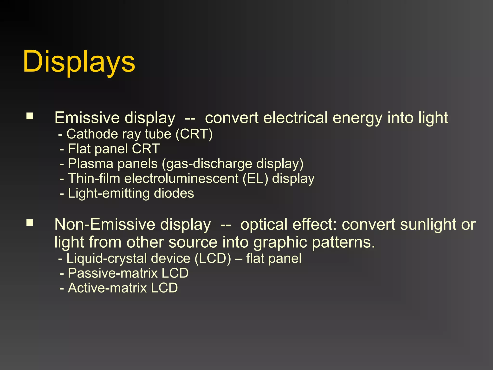 This document discusses different types of displays including emissive displays like CRTs and LEDs, and non-emissive displays like LCDs. It focuses on describing the components and workings of CRT displays, including the electron gun, phosphor coating, and use of shadow masks for color displays. Key properties of CRTs discussed are phosphor persistence, refresh rate, resolution, and dot pitch. The document also compares vector and raster output scan technologies, and describes the components of a basic raster display system including the frame buffer, video controller, and color look-up table.