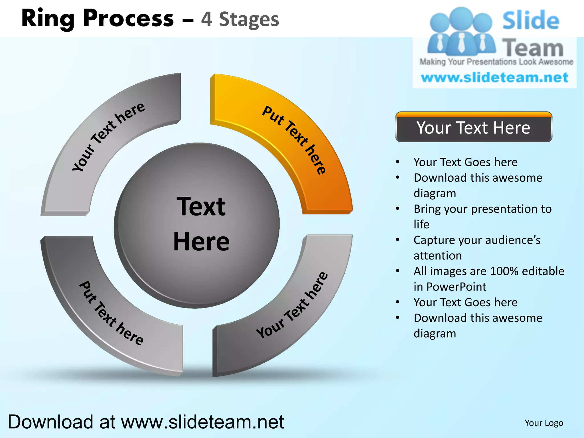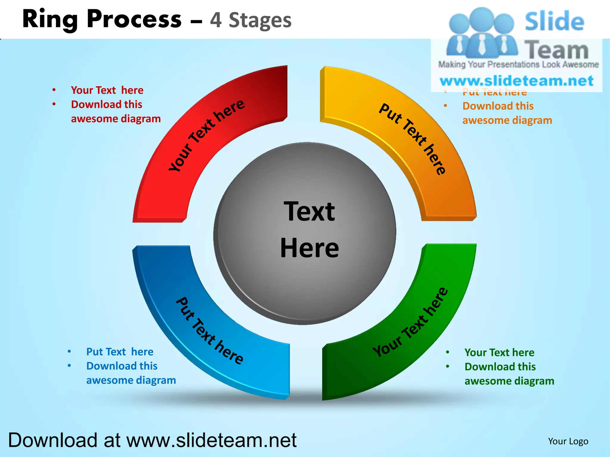 The document describes a 4-stage ring process diagram. It includes instructions to edit the diagram text, colors, sizes, and orientations of icons. The diagram and editing instructions can be downloaded from the provided website for use in PowerPoint presentations.