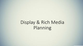 This document discusses rich media advertising, including an overview of different rich media ad formats and best practices. It provides statistics showing that search and display advertising make up over 50% of digital ad spending in India. Various rich media ad formats are defined, such as in-page ads, expanding ads, floating ads, transitional ads, takeover ads, mastheads, and engagement ads. Metrics for measuring the success of rich media ads such as click-through rate, interaction rate, and action rate are also discussed.