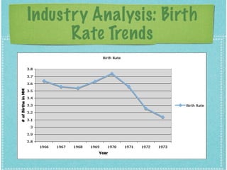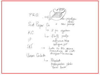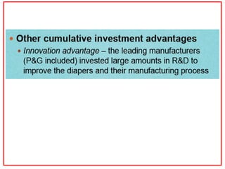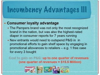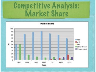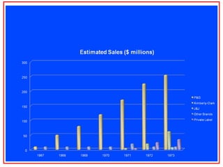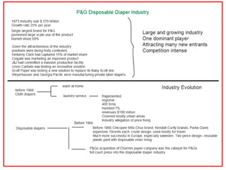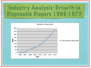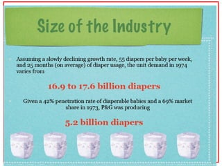 The document discusses the disposable diaper industry in the United States from the 1960s-1970s. It summarizes that Procter & Gamble dominated the market with over 65% share in 1973 due to investments in research and development, manufacturing efficiencies, and heavy advertising spending. Kimberly-Clark was the main competitor but had higher costs and a later start distributing nationally. The industry grew rapidly as more women worked and diapers became seen as more convenient than cloth.