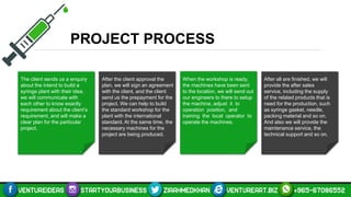 The document outlines the process of establishing a syringe manufacturing plant, including client communication, project planning, workshop construction, machine production, and after-sales service. It details the roles of key project team members, the machinery required for production, and the steps involved in manufacturing, sterilizing, and packaging syringes. Additionally, it emphasizes the importance of quality materials, effective training, and technical support in maintaining production efficiency.