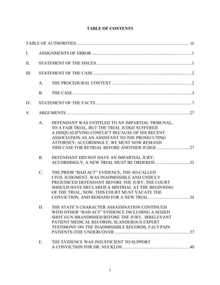This document is an appellate brief filed on behalf of Dr. William Nucklos, who was convicted on 20 counts relating to prescribing controlled substances. The brief raises 8 assignments of error, arguing that Dr. Nucklos was entitled to an impartial tribunal and jury but did not receive one. It also argues that prejudicial "bad act" evidence was improperly admitted, the evidence was insufficient to support the conviction, the jury was improperly instructed, and exculpatory evidence was withheld. The brief seeks to have Dr. Nucklos' conviction vacated and the case remanded for a new trial on these grounds.