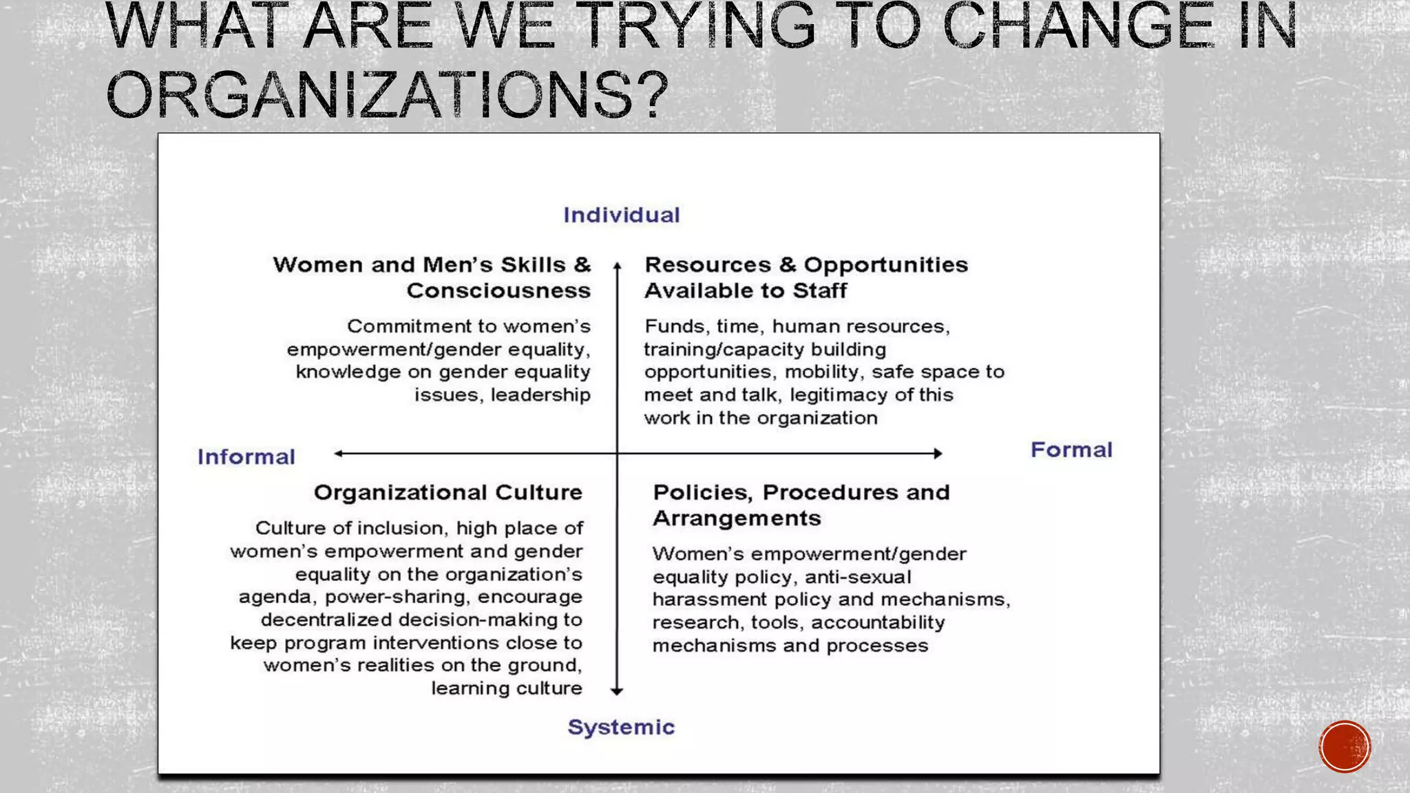 Aruna Rao presented at the London School of Economics on January 24, 2014. She discussed Gender at Work, an international collaborative committed to building organizational cultures of equality and social justice, especially gender equality. Formed in 1999, Gender at Work provides capacity building and consulting services to help organizations challenge underlying structures that perpetuate gender inequality. Rao discussed analyzing institutions and organizations to uncover power dynamics and cultural norms that maintain inequality below the surface. She provided examples of work empowering women farmers and supporting women-led unions in challenging discrimination.