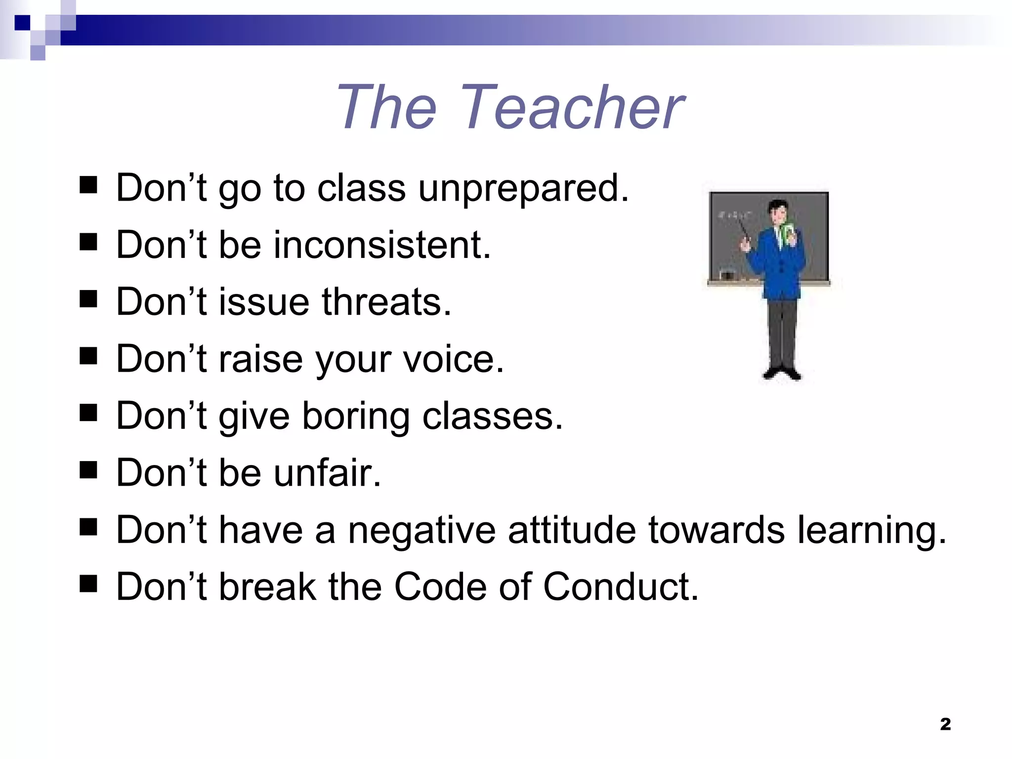 The document discusses various causes of disruptive behavior in classroom settings from both teacher and student perspectives. It identifies factors like time of day, student attitudes, desire for attention, boredom, and external factors that can influence student behavior. It also discusses the role of the teacher in preventing problems through enthusiasm, professionalism, building rapport, and having a clear code of conduct. The document provides guidance on how teachers should respond to disruptive behavior, such as acting immediately, focusing on the behavior not the student, treating students fairly, keeping calm, and seeking guidance from colleagues.