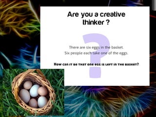 The document discusses disruptive thinking and techniques to encourage it such as brainstorming and mind mapping. Disruptive thinking results in imaginative and unexpected solutions by breaking routine patterns. It is important because habits can stifle creativity, and thinking outside the box exposes us to new ideas and perspectives. However, disruptive thinking can be challenging due fears of criticism or tradition. The document provides examples of using mind maps to narrow topics and make connections in order to overcome blocks and strengthen creative abilities.