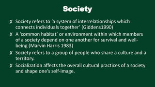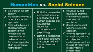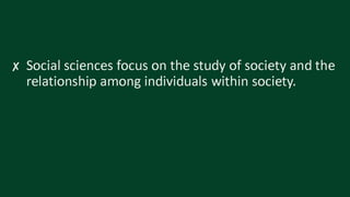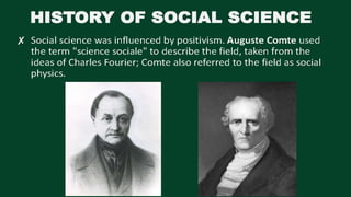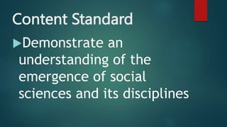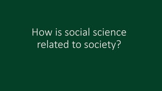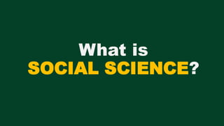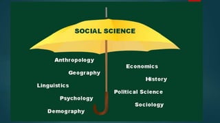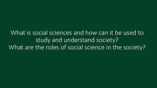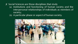 The document discusses defining social sciences as the study of society and its various disciplines. It differentiates social sciences from natural sciences and humanities. The objectives are to define social science, explain its importance, and differentiate it from other fields. Various activities are presented like unjumbling words related to social sciences and analyzing a photo to identify social problems. The importance of social sciences in understanding and addressing issues faced by society is highlighted.