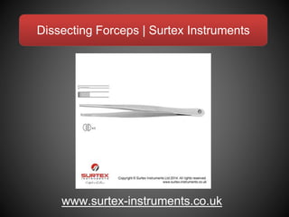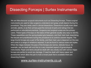 The document describes a manufacturer of surgical instruments, particularly dissecting forceps, used by surgeons and surgical nurses to grasp small objects during procedures. These forceps vary in size and style, with narrow ridges for delicate tissues and broader jaws for heavier materials. The document emphasizes the importance of these instruments in both surgical and educational dissection practices.