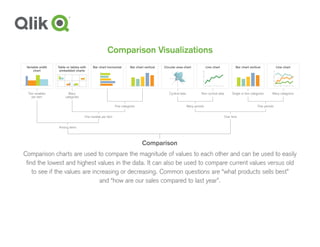 The document discusses various types of data visualizations, categorizing them into comparison, composition, distribution, and relationship charts. It outlines the purpose and application of each chart type, highlighting how they can help answer specific analytical questions. Examples include pie charts, stacked bar charts, scatter plots, and histograms, each serving distinct roles in data analysis.
