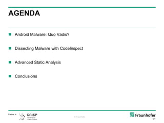 The document discusses the challenges and methods of analyzing sophisticated Android malware, emphasizing the limitations of both static and dynamic analysis. It introduces tools like CodeInspect and FuzzDroid for hybrid analysis, combining various techniques to improve detection capabilities. Conclusions highlight the necessity of aiding human analysts and the use of hybrid approaches to effectively combat malware threats.